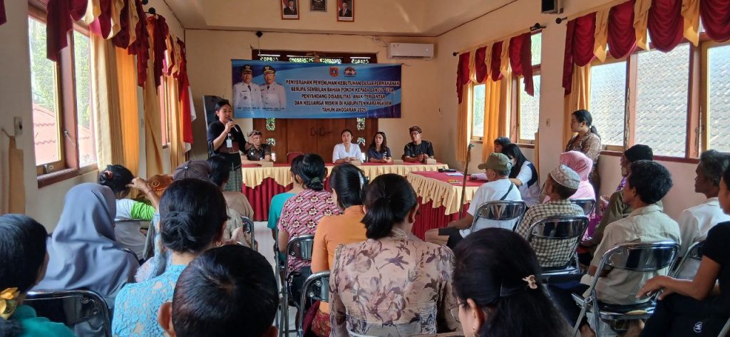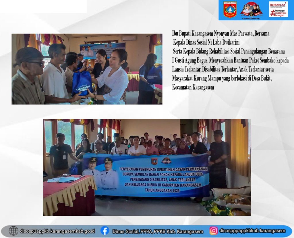 Nyonya Mas Parwata selaku Ibu dari Bupati Karangasem yang di dampingi oleh Kepala Dinas Sosial, PPPA dan PPKB serta Kepala Bidang Rehabilitasi Sosial Penanganan Bencana, ikut serta dalam penyerahan paket sembaki kepada Disabilitas Terlantar, Anak Terlantar, Lansia Terlantar beserta Masyarakat yang kurang mampu